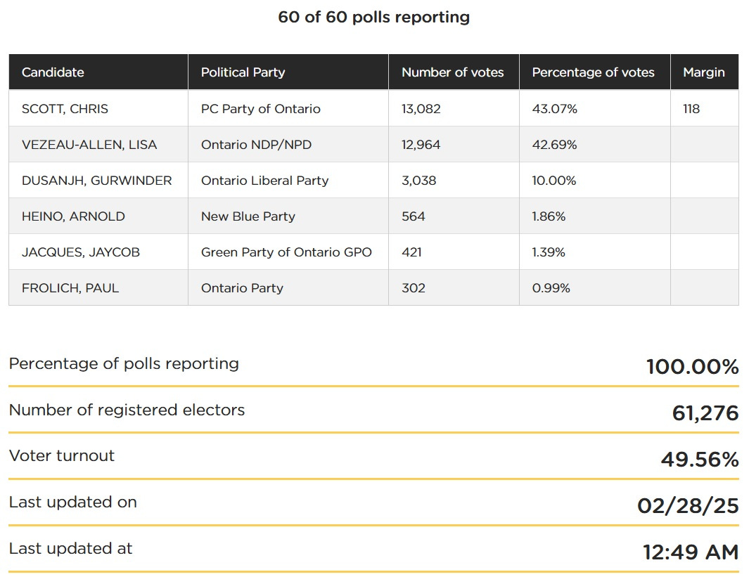 Wow. With 100% of the polls reported, the PCs retain Sault Ste. Marie by a mere 118 votes, the smallest margin here in 120 years. Newbie PC candidate Chris Scott appears to have won over veteran City Councillor and NDP candidate Lisa Vezeau-Allen in an absolute squeaker.
