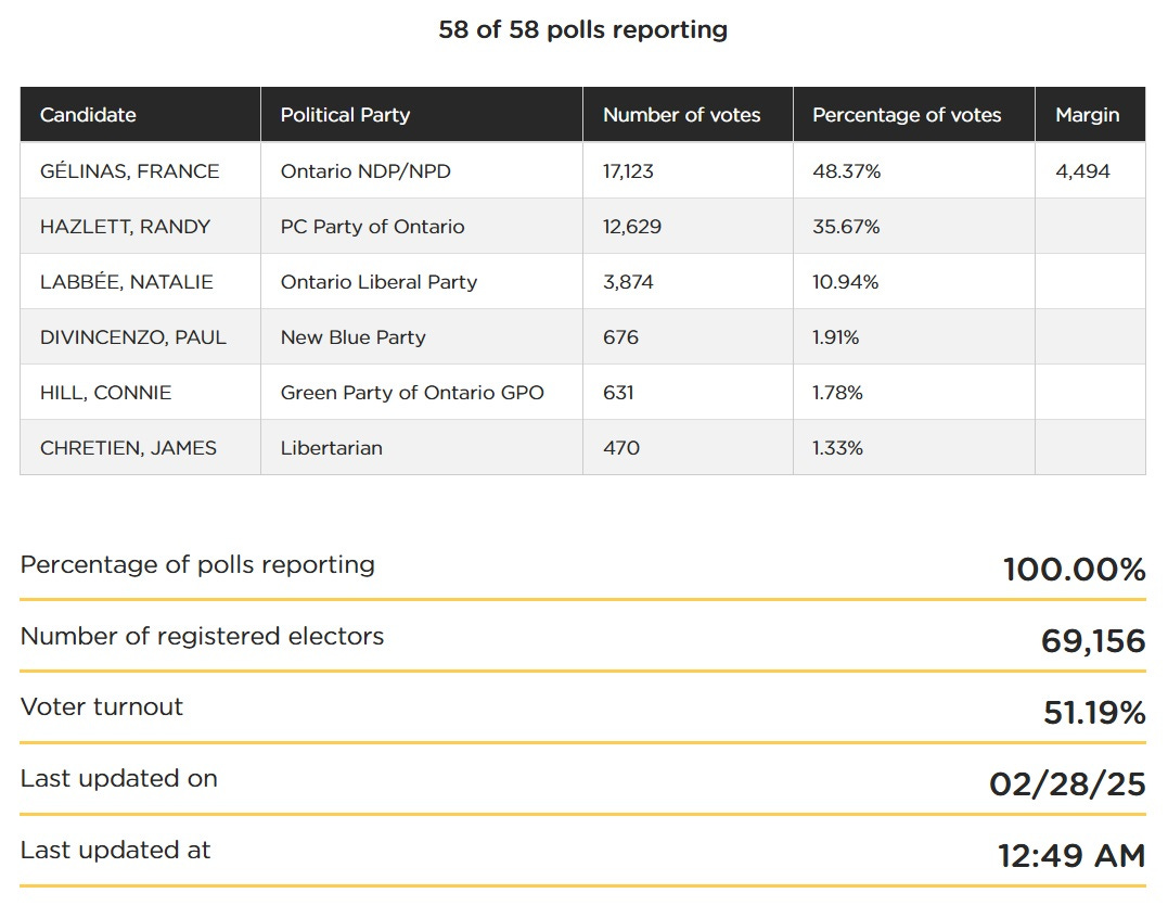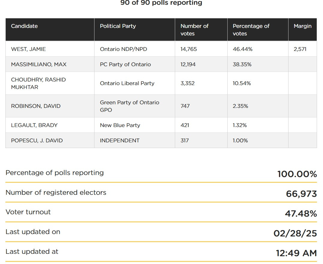 NDP incumbent, Jamie West, retains his seat and will return to Queen’s Park for Sudbury. A closely fought race with local pizza shop owner Max Massimiliano that resolved into a solid 46% victory for West. And Sudbury gets to keep its excellent pizza.