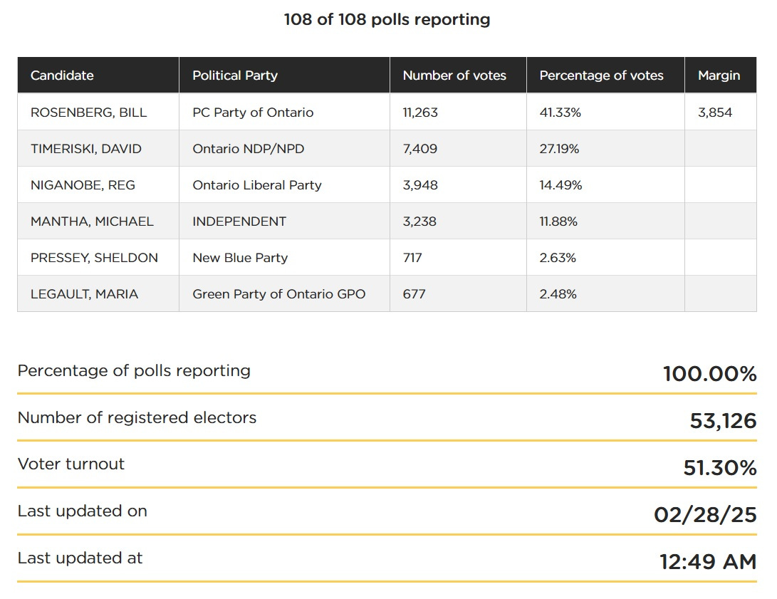 The 2025 provincial election is over, and Premier Doug Ford’s PC party will be returning a majority government to Queen’s Park in Toronto, a record-breaking third straight. It is a mixed bag for all major parties, with the PC realizing only a small increase in both seats and popular vote. Turnout was predictably low for a midwinter snap election called on dubious grounds. Elections Ontario is reporting province-wide turnout at 45.4% of eligible voters.
